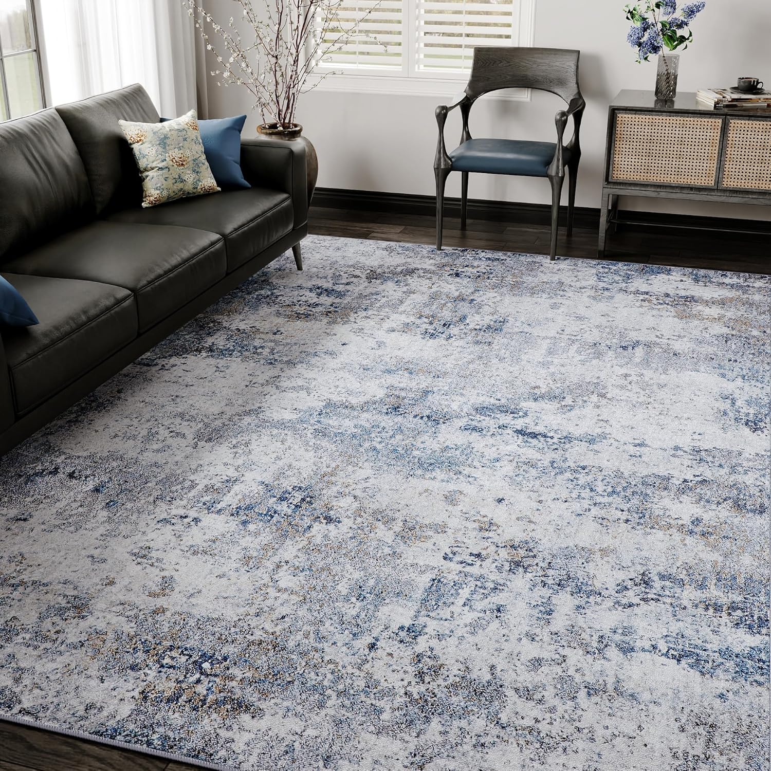 Crafted with a unique abstract pattern, this large area rug adds a touch of sophistication to your interior design. The soothing grey and blue color palette complements a variety of decor styles, while the distressed finish gives it a trendy and lived-in look.