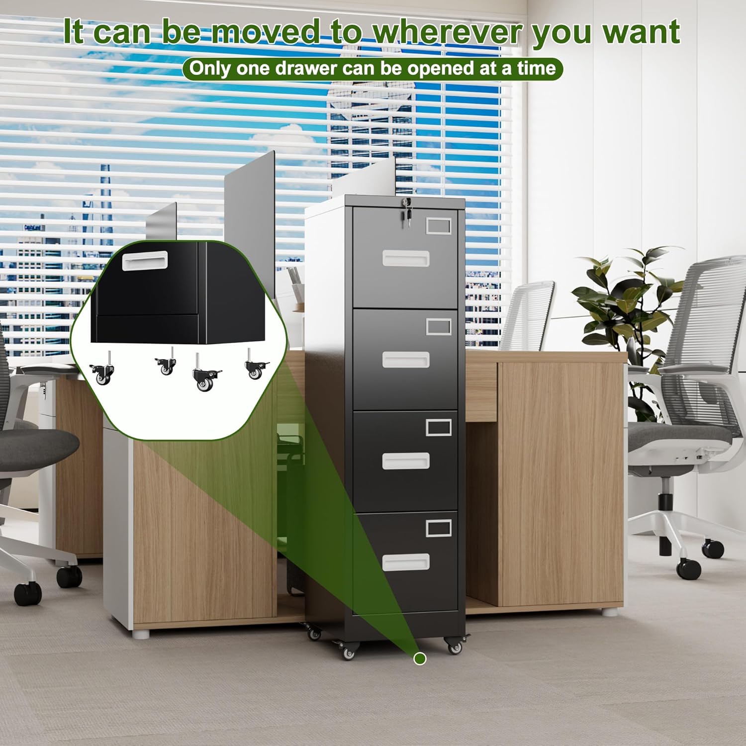 Aobabo File Cabinet 4 Drawer with Wheels, Lockable Office Metal Filing Cabinet with Name Card for Office and Home,Assembly Required,Black